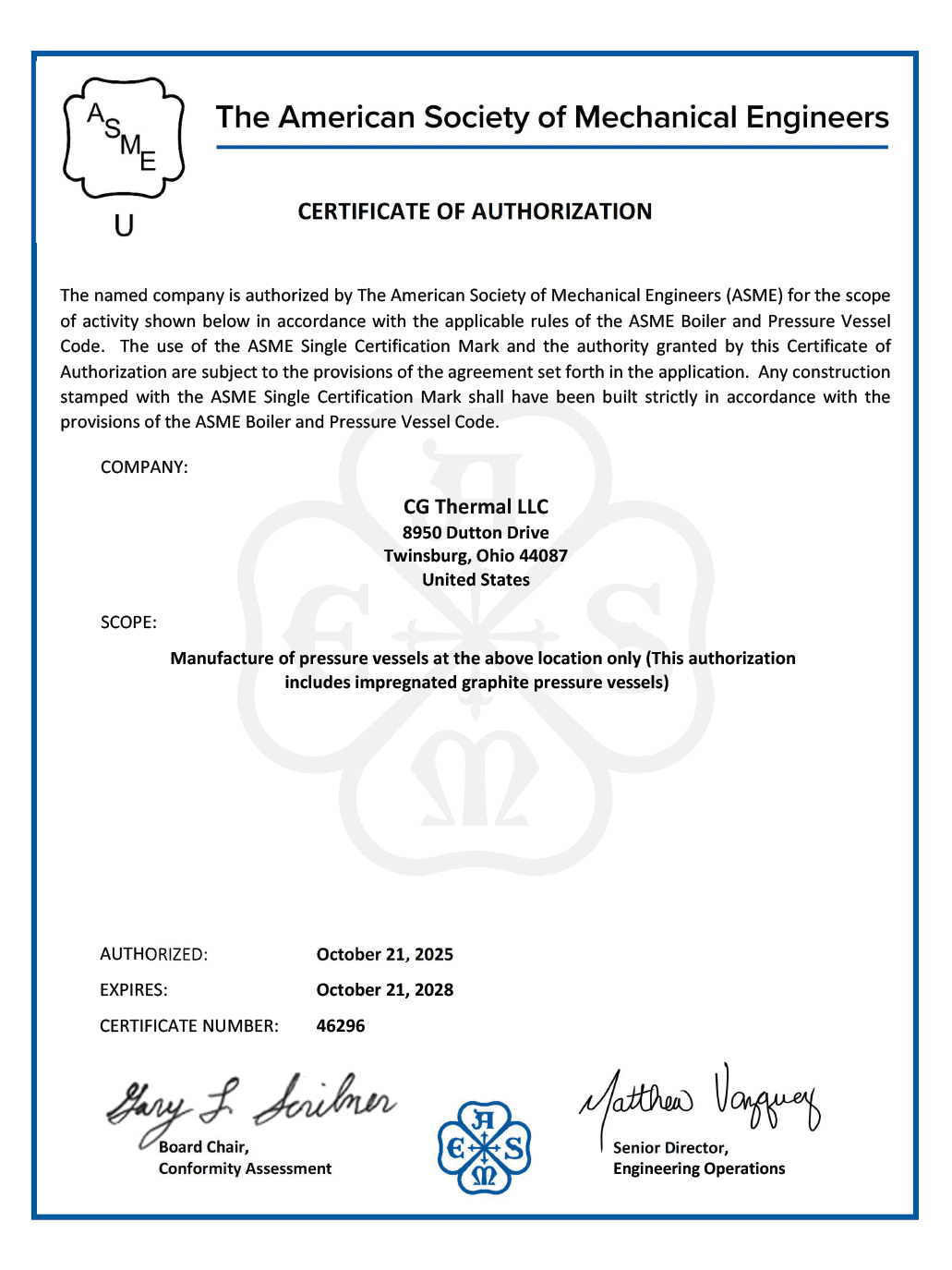 Under this certificate, CG Thermal is qualified to design and fabricate pressure vessels in compliance with the ASME Boiler and Pressure Vessel Code. All ASME U-Stamped vessels are constructed under the oversight and quality-control requirements defined and approved by ASME and require approval from an Authorized Inspector.