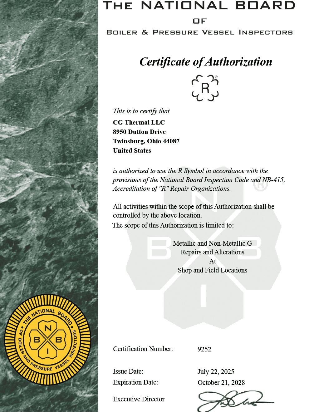 CG Thermal holds a National Board Certificate of Authorization for use of the “R” Stamp, allowing us to perform repairs and alterations on pressure-retaining items in accordance with the National Board Inspection Code (NBIC). This authorization covers both metallic and non-metallic vessels, including our impregnated graphite vessels, for work completed both at our facility and in the field. Application of an “R” Stamp to a vessel requires compliance with the NBIC and approval by Authorized Inspectors.